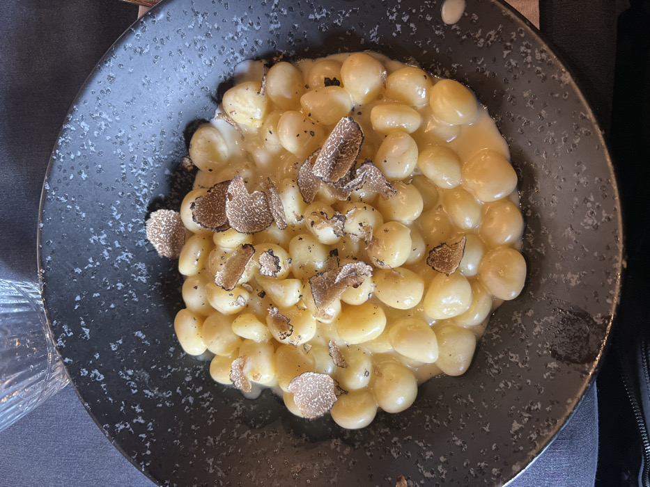 - "The image displays a close-up, top-down view of a single serving of gnocchi with truffle, positioned centrally within a dark, wide-rimmed ceramic bowl" by FM-t80Kg1, licensed under CC BY 4.0