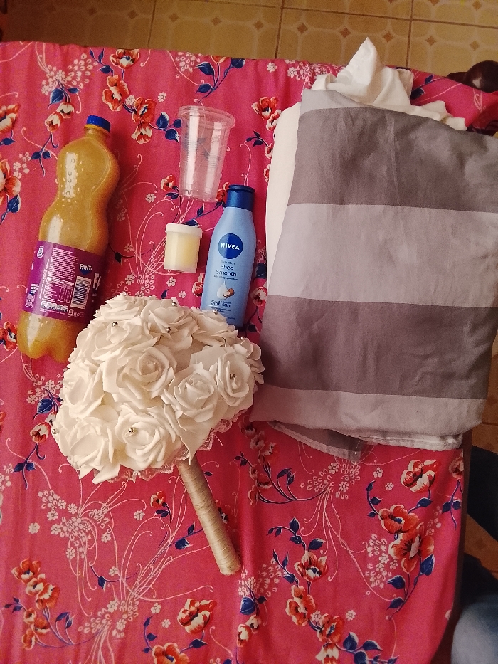 In Kiambu Township ward, Kenya, an overhead static shot displays various objects arranged on a pink textile surface patterned with red, blue, and white floral motifs. A white artificial rose bridal bouquet, adorned with small silver beads and featuring a beige ribbon-wrapped handle, rests towards the lower-left quadrant. To its immediate right, a blue plastic bottle of NIVEA Shea Smooth lotion with a white cap stands upright. Above the lotion bottle and slightly to the left, a small, cylindrical, translucent yellow container is visible. Centered above this container is an empty, clear plastic drinking cup. On the far left of the frame, a clear plastic bottle containing an orange-yellow Fanta beverage, complete with a blue cap and purple label, is positioned vertically. To the far right, a folded fabric item with alternating light and dark grey horizontal stripes occupies a portion of the frame. The upper-right background reveals light brown square floor tiles. No individuals are present, and no actions or interactions are depicted.