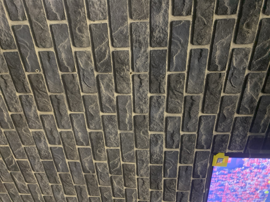 A textured gray brick-style wall covers most of the image. The bricks are rectangular and appear slightly curved, suggesting the wall is part of an arch or curved surface. The mortar between the bricks is a light beige color. A corner of a television screen is visible in the lower right, displaying a colorful image. A small yellow sticker with a black square is attached to the TV frame.