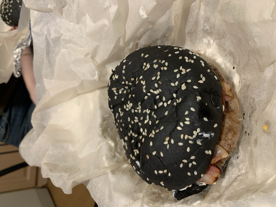 A black burger bun with white sesame seeds sits atop white parchment paper. The burger appears to contain meat, bacon, and white sauce. Another black burger is partially visible in the upper left corner, wrapped in foil and parchment. A person wearing blue jeans is partially seen in the background. The scene is lit naturally, with light reflecting off the parchment paper. A section of brown furniture is visible in the lower left.