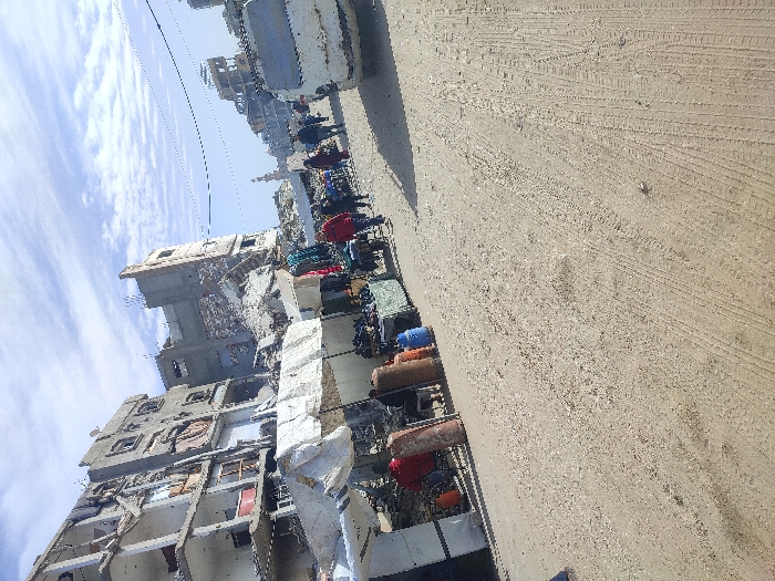 The image displays a damaged street scene in Khan Yunis, Palestinian Territory. The ground consists of an unpaved dirt road with prominent tire tracks. Along the left side, multiple multi-story concrete buildings stand severely damaged, exhibiting partial collapse, exposed rebar, and debris. Adjacent to these structures, a series of makeshift market stalls, covered by white tarpaulins, are active, displaying goods such as clothing. Several gas cylinders in brown, blue, and orange are positioned near the stalls. Approximately 10-15 individuals, dressed in civilian attire, walk along the dirt road; some are near the market stalls, others further in the distance. A white utility van, showing signs of wear, is visible on the right side of the road, facing away from the camera. In the background, additional damaged buildings and a distinct mosque minaret are discernible under a partially cloudy blue sky, with overhead power lines traversing the frame.