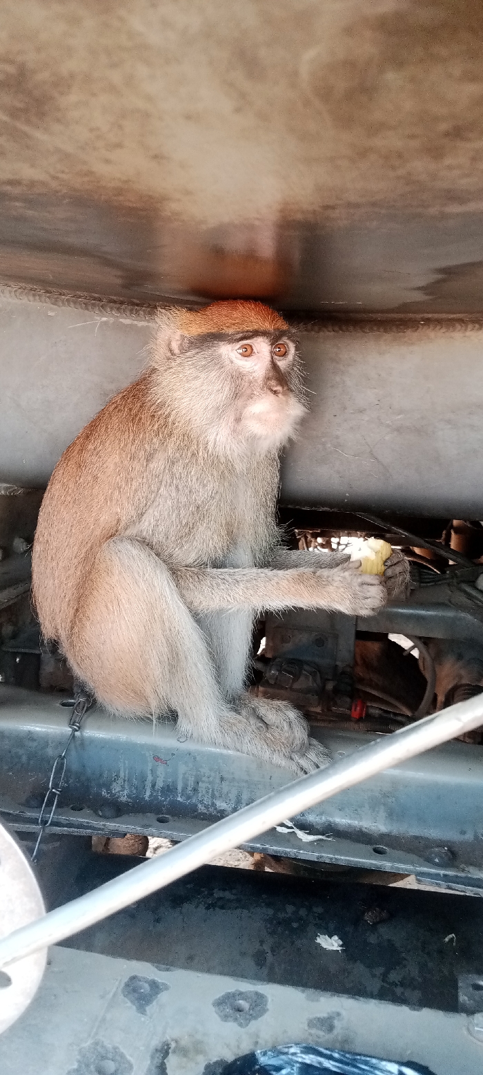 This image, reported to be from Gwagwalada, Nigeria, depicts one Patas monkey (Erythrocebus patas) seated on a dark grey, weathered metal structural beam
