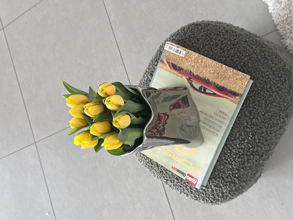 The scene is an indoor environment located in Tielrode, Belgium. A metallic, irregularly shaped, silver-toned vase containing approximately 10-12 yellow tulips is positioned centrally. The tulips feature green stems and leaves, with blossoms mostly closed or partially open. The vase rests upon a magazine titled "AUTO Classiccars" with "PORSCHE" prominently displayed, featuring a red Porsche sports car on its cover. This magazine, in turn, is placed on a dark gray, shaggy-textured, cylindrical or oval stool. The background consists of a light gray tiled floor with visible grout lines. A section of a lighter-colored, shaggy rug is visible on the lower right, adjacent to the stool. No people or animals are present.