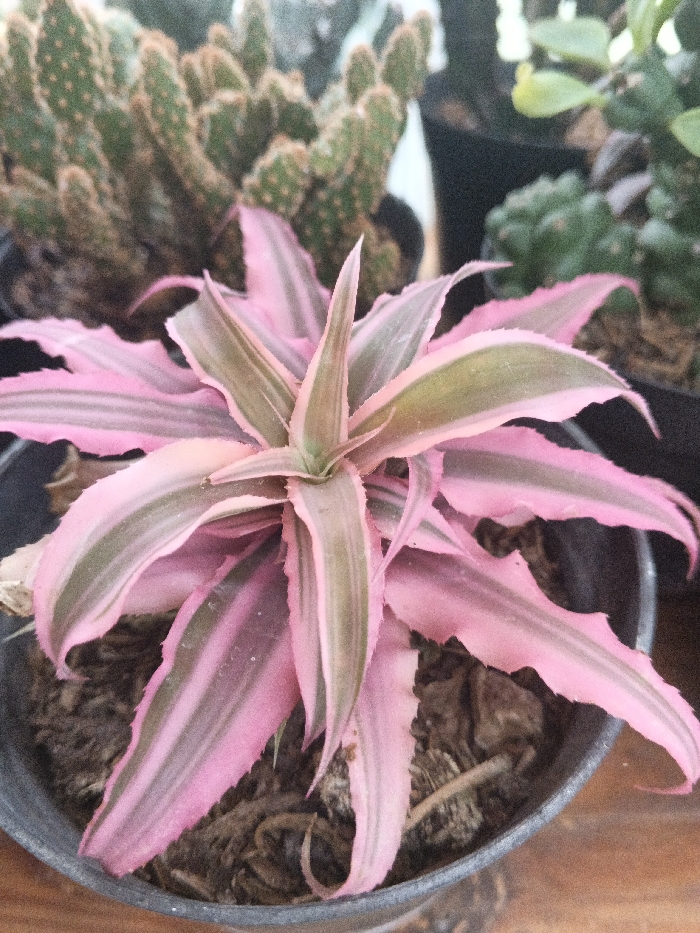 The scene is depicted as being in Munyati, Zimbabwe. The primary subject is a potted variegated bromeliad plant, possibly a Cryptanthus, centered in the frame. Its lanceolate leaves exhibit a prominent pink coloration with irregular longitudinal green stripes, arranged in a rosette formation. The leaf margins feature small, pointed serrations. The plant is situated within a dark gray or black plastic pot filled with dark, granular soil interspersed with fibrous organic material. In the blurred background, several other potted plants are visible. To the upper left, a cluster of green cactus stems, characteristic of *Opuntia microdasys* (bunny ears cactus), is present in a dark pot. To the upper right, indistinct green foliage from other potted succulent-type plants can be observed. All background plants are similarly housed in dark containers. The plants rest on a light brown, flat surface, consistent with wood, which is partially visible at the bottom of the frame. No human figures, animals, or discernible actions are depicted. The environment suggests an indoor or sheltered outdoor setting for plant cultivation or display.