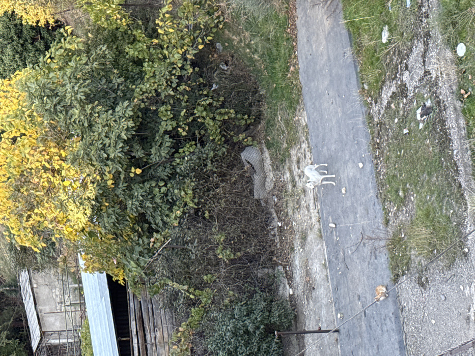 The image depicts an outdoor area in Tbilisi, Georgia, characterized by unkempt vegetation and rudimentary structures, viewed from an elevated perspective. In the central foreground, a light-colored, short-haired dog, appearing white or light grey, stands on a grey concrete pathway, its head turned slightly towards the viewer. Small rocks and debris are scattered on this path. To the lower left, an orange tabby cat is seated on a separate, lighter concrete surface, facing towards the right side of the frame. The midground features dense, wild vegetation, including large trees with yellowing and green leaves, and thick, dry undergrowth. Behind this foliage, to the upper left, a small, weathered building with a grey, possibly slate or corrugated, roof is visible. Below it, a larger structure with a blue corrugated metal roof is partially obscured by trees and a wooden fence. Scattered litter and discarded materials are visible within the overgrown areas. A dark-colored utility pole stands on the left, with wires extending horizontally across the lower portion of the image. The background consists of further tree-covered hillsides and faint outlines of distant structures, suggesting a semi-urban or peri-urban setting.