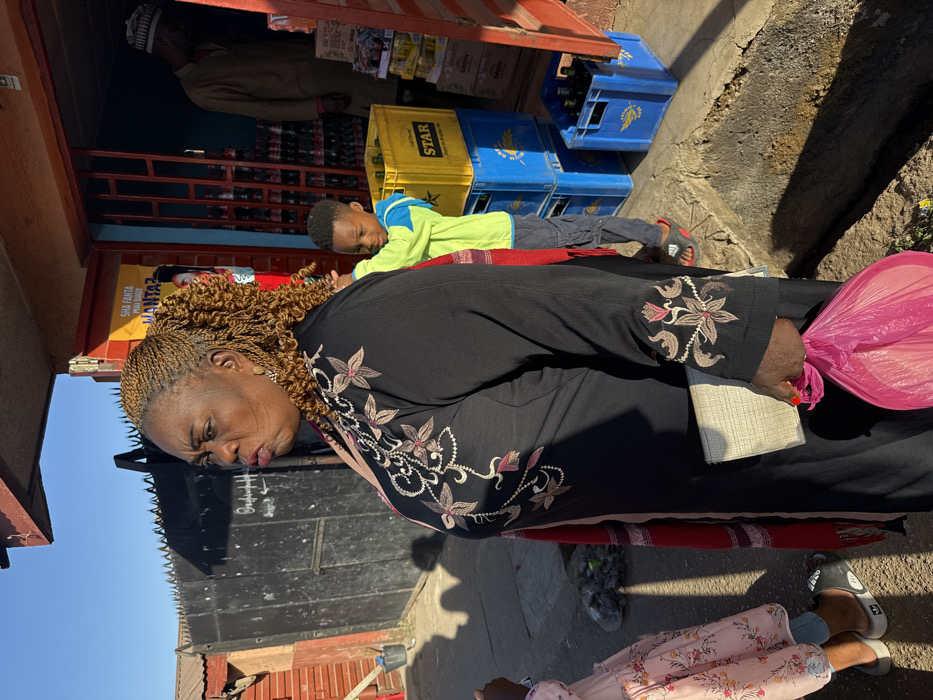 This image depicts an outdoor street scene in Jos, Nigeria, under bright daylight conditions, evidenced by strong shadows cast on the ground. A dark-skinned adult female is prominently featured in the center-left foreground, standing in three-quarter profile, facing left. She wears a black long-sleeved dress with elaborate floral embroidery in brown and pink tones, accented with white beadwork on the chest and cuffs. A red and striped scarf is draped over her left shoulder. Her hair is styled in light brown micro braids, with the back portion pulled into ringlet curls. Gold-colored hoop earrings are visible. Her mouth is slightly pursed. She holds a light-colored, textured clutch in her left hand and a translucent bright pink plastic bag in her right hand; her fingernails are painted red. Behind the woman and to the right, a dark-skinned young boy stands facing slightly left, wearing a neon green and blue long-sleeved top, dark grey trousers, and black and red slides. His hands are positioned near his lower back. He stands adjacent to a small storefront or kiosk with a red metal frame and a blue interior wall. Inside, shelves are stacked with various bottled beverages, including what appear to be Coca-Cola products. A yellow sign within the store displays 'SHA FANTA HAI DAU?', suggesting a Fanta advertisement and using the Hausa language. Stacked yellow 'STAR' branded plastic crates, typically used for beer bottles, and other blue plastic crates containing bottles are visible on the ground outside the store. Partially visible inside the storefront is a dark-skinned adult male wearing a light-colored traditional garment and a skullcap (kufi). To the far left of the main female subject, a child's lower legs are visible, wearing a pink floral dress over blue trousers and grey Adidas-branded slip-on shoes. The background on the left features a dark corrugated metal gate, topped with anti-climb spikes. The ground is paved, with a shallow concrete drainage channel running in the foreground. A small accumulation of refuse is present on the ground to the far left.