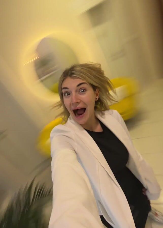 A woman with blond hair, wearing a white blazer over a black dress, is holding a phone up and recording a selfie video. She looks at the camera, smiles, then opens her mouth wide in a faux yawn. She then moves her hand towards the camera lens until it's covering the shot. She moves her hand away from the lens and the video continues. The background shows an indoor space with white walls, a light fixture, and a green potted plant. A round, gold-colored object is affixed to the wall. The video is shaky and out of focus at times.
