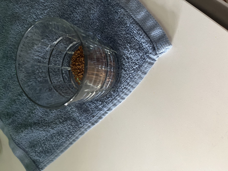 A clear, faceted glass tumbler containing a small quantity of brown granular material, identified as instant coffee, rests on a light blue terrycloth towel
