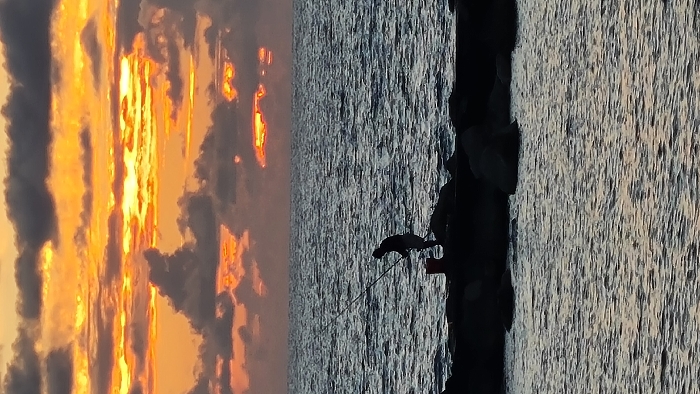 This image depicts a coastal scene in Nahariyya, Israel, at either sunrise or sunset. The sky, occupying the upper two-thirds of the frame, displays vibrant orange, yellow, and red light emanating from the horizon, interspersed with dark gray clouds. The Mediterranean Sea fills the lower portion, appearing dark blue-gray with visible surface ripples extending towards the horizon. In the middle ground, a single silhouetted individual stands on a dark, rocky formation, identified as a breakwater. This person is holding a fishing rod, with the line extended towards the water. A red bucket is placed on the rocks immediately to the left of the individual. The immediate foreground water displays subtle reflections of the sky's light.