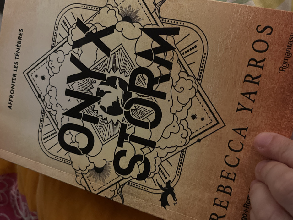 A book cover with a gold background features a large, diamond-shaped design. Inside the diamond, bold black lettering spells "ONYX STORM." Below the title is a stylized drawing of a bat silhouette. The diamond is adorned with clouds and stars. The book's author is listed on the right side of the cover as REBECCA YARROS in black capital letters. "Romantasy" is printed as a description near the bottom. The title "affronter les ténèbres" is printed on the side.