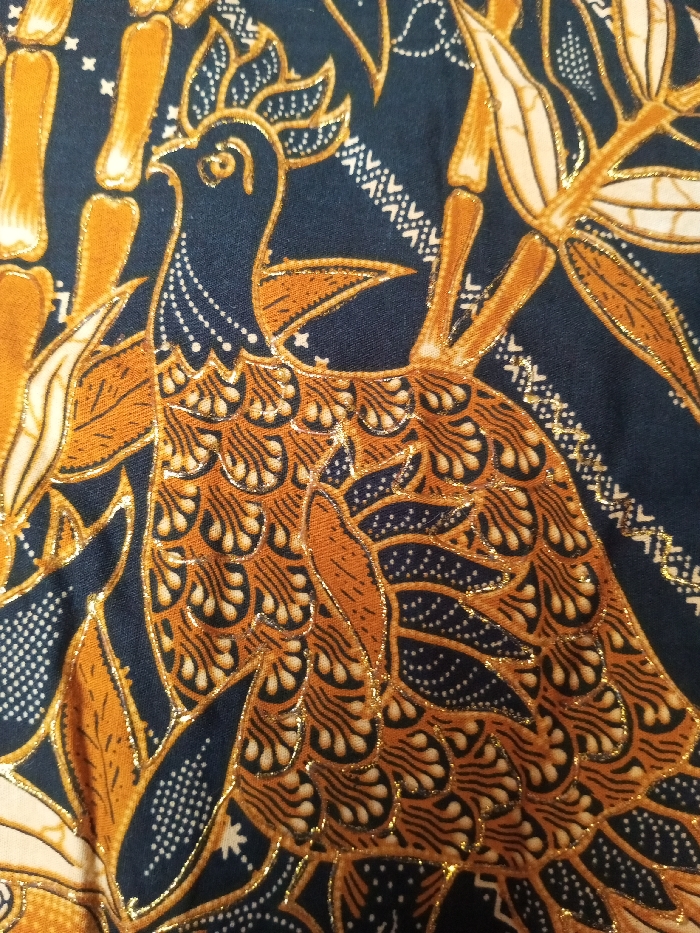 The image showcases a detailed batik pattern. A stylized bird figure with ornate feather details dominates the scene, colored in hues of brown and gold. The background is a dark blue, adorned with botanical elements resembling bamboo and leaves. Fine gold lines outline the shapes, adding a touch of elegance to the traditional design. Various small geometric patterns embellish the background, completing the artistic composition.