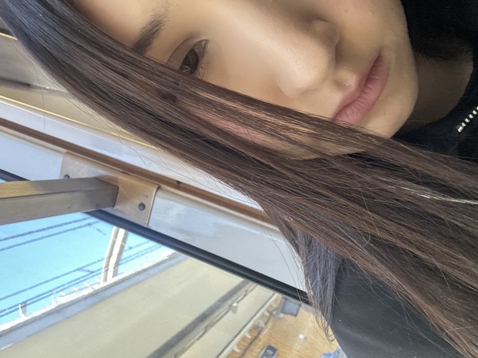 The image depicts a partial close-up of a female individual inside a public transport vehicle, consistent with a train or metro operating near Gentilly, France. The subject's right eye, nose, and lips are visible on the right side of the frame. She has long, dark brown hair, some strands of which drape across her face. Her right eye is directed downwards, and her lips are closed in a neutral expression. She wears a dark garment, possibly a zipped jacket, visible around her lower face and shoulder. Through a window on the left, an exterior scene is visible: a clear blue sky with overhead electrical lines and a light-colored building structure, potentially a station platform, are discernible. The window frame is metallic with visible fastening points. The overall environment suggests the interior of a commuter train or metro car.