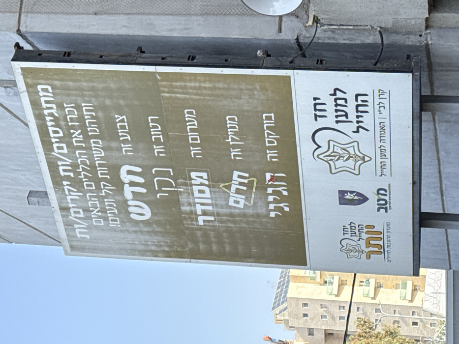 sign with a message to new recruits. It advises them to remember the following rules: "Painted is new," "Wet is clean," "Piled is organized," "Manilla is emergency," and "Burekas is hygienic." The sign also includes logos for "Together for the Soldier," "LBI Fund," "The Association for the Soldier," "Metav," and "Yoter - Club for the benefit of soldiers."