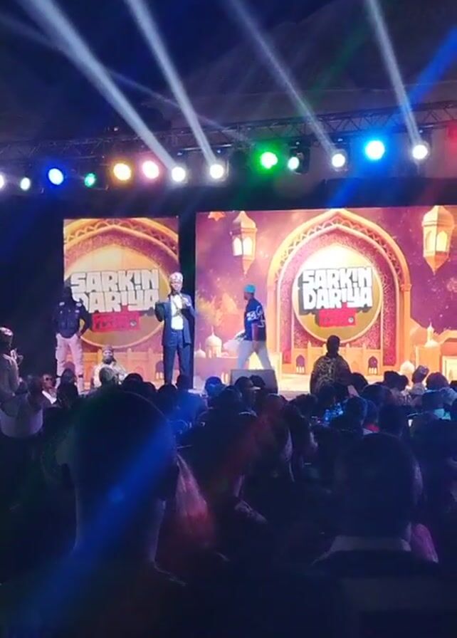 stage during an event, featuring a man in a suit speaking to a crowd. Behind him, two large screens display the event's logo, which includes the words "Sarkin Dariya." On the stage, there are also other people standing or moving around. The audience is visible in the foreground, with many people holding up their phones. The lighting is dramatic, with spotlights shining down on the stage.