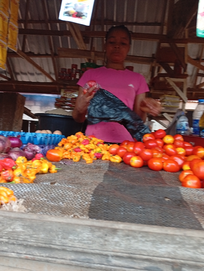 The image displays a market stall in Omicha Umu Awada, Nigeria. A female vendor with dark hair styled in braids, wearing a pink t-shirt, stands behind a sales counter. She holds a clear plastic bag containing a red tomato in her left hand, with her right hand positioned near the bag. The counter surface is covered by a dark, woven mat. Arranged on the counter are piles of fresh produce: red tomatoes on the right, orange and red habanero-type peppers in the center, red onions, and brown eggs in a blue plastic crate on the left. A large black plastic basin is visible behind the eggs. Two clear plastic bottles, one containing water and another a clear liquid, stand on the counter's right side. The stall is sheltered by a corrugated metal roof supported by exposed wooden beams and rafters. A laminated poster depicting produce hangs from the roof structure in the upper left. The background reveals shelves stocked with various packaged goods.