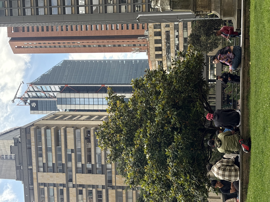 A group of people sit on a low ledge in a park, with a tree between them and the viewer. Behind the tree, multiple buildings rise, varying in color and architecture. One building features a crane atop it. The sky is visible in small patches between the structures, with hints of clouds. A stone monument stands slightly above and to the right of the buildings. The image is oriented sideways.
