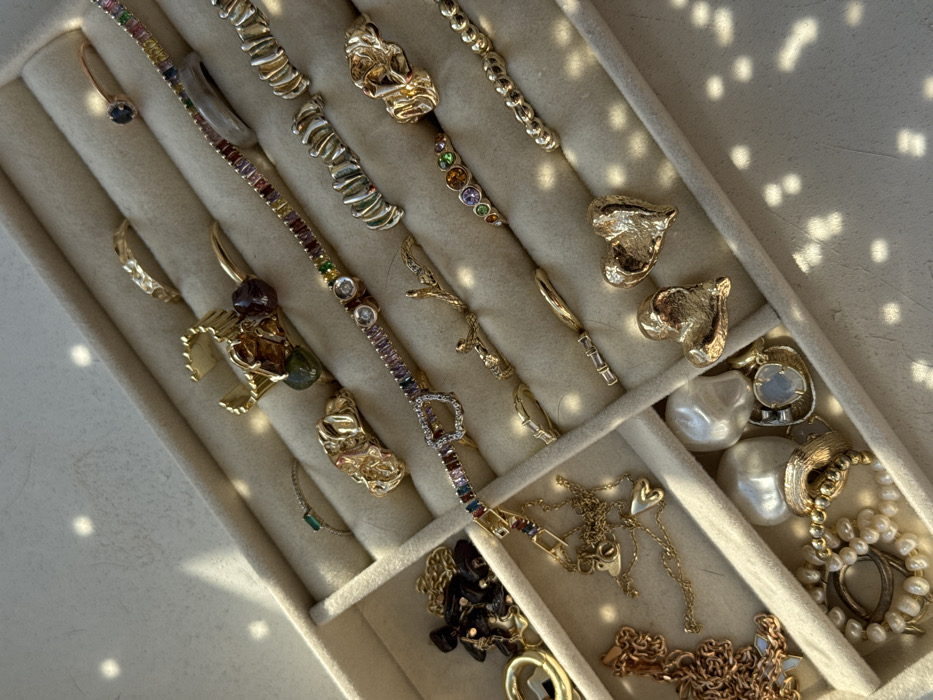 - "The scene, observed in Moscow, Russia, displays a collection of assorted jewelry items within a multi-compartment, beige velvet or felt jewelry organizer tray" by FM-xqHZp2, licensed under CC BY 4.0