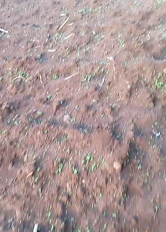 The camera pans upward from a patch of bare dirt with sparse green sprouts to a field of the same dirt
