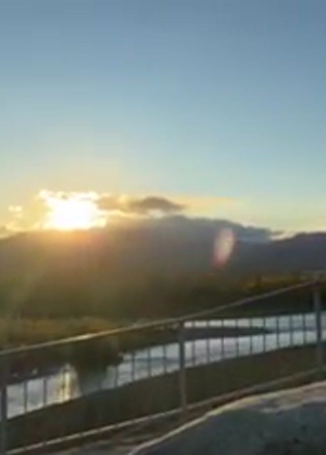 scenic landscape at sunset. In the foreground, a grey metal railing stands on a rocky outcropping. Beyond the railing, a river winds through a forested valley. The trees appear to be turning yellow and gold, indicating autumn. In the distance, mountains are visible under a blue sky with scattered white clouds. The sun is partially obscured by the clouds, creating a bright, hazy light. The camera slowly pans to the right, revealing more of the rocky terrain and a tall rock formation on the edge of the frame. The overall impression is one of tranquility and natural beauty.