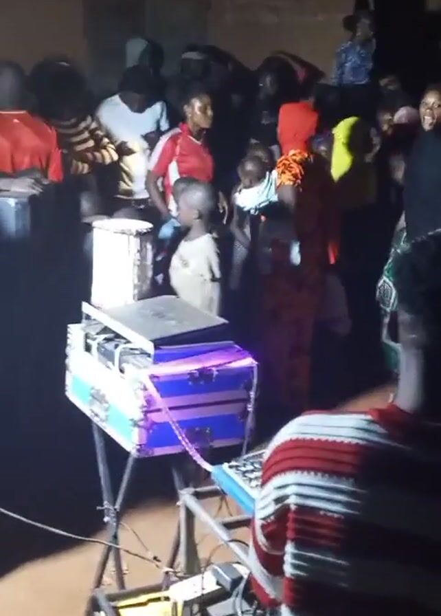 group of people gathered outside at night, seemingly enjoying a party or event. A DJ setup is visible in the foreground, with a DJ wearing a striped shirt standing behind the equipment. The crowd includes adults and children, some of whom are looking towards the DJ. The lighting is dim, and there's a building in the background, likely a house. Some of the people are wearing casual clothes, and there's a sense of community and celebration in the atmosphere.