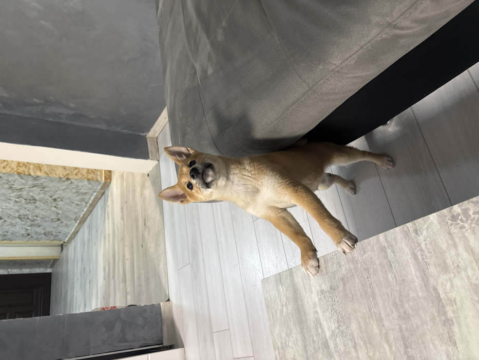 An indoor scene in Pernik, Bulgaria, depicts a light brown dog, consistent with a Shiba Inu puppy, standing in an upright bipedal posture on a light-colored floor