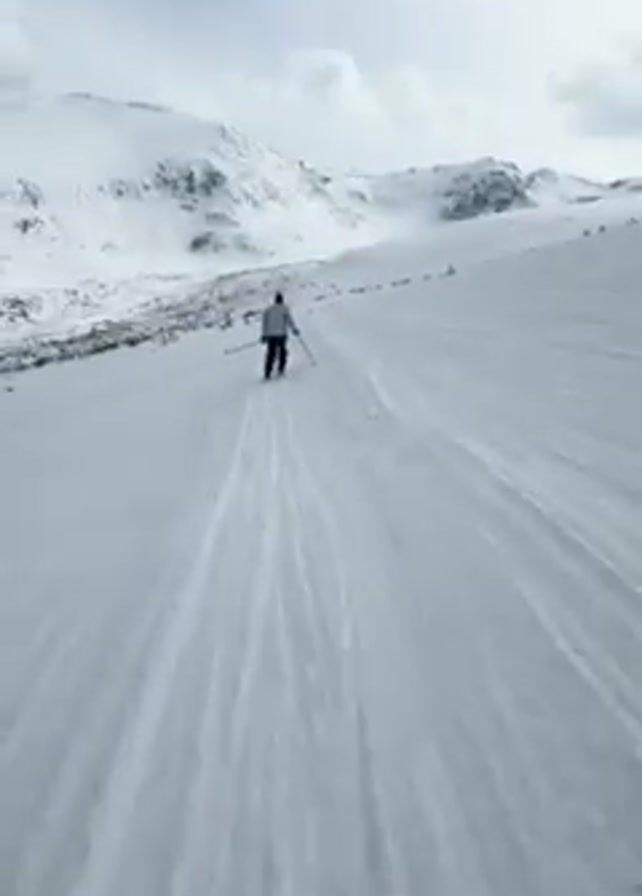 A person is skiing down a snowy slope, filmed from a first-person point of view, following another skier in front. The camera points downward to the skis, then shifts upward to reveal a mountain range in the background under a cloudy sky. The video then alternates between the skier in front and the snowy landscape, showing an overhead ski lift.