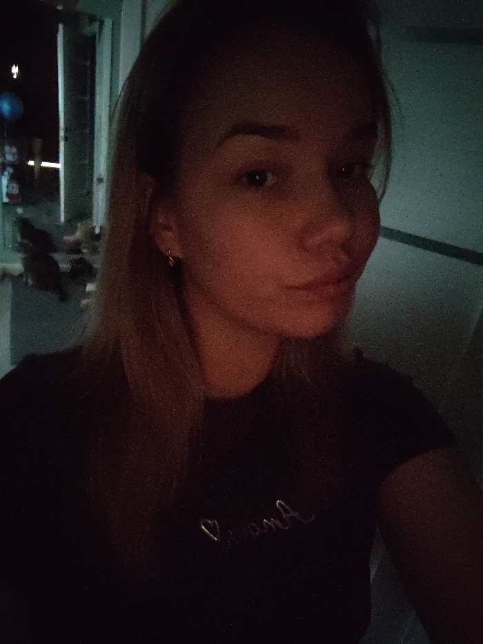 A woman with blonde hair and light skin looks at the camera. She wears a dark-colored t-shirt with a subtle design near the chest. A window is visible in the background on the left. The lighting is dim, creating shadows on her face and clothing. The image quality is grainy, and the color tones are muted.