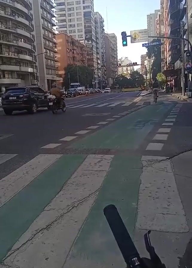 A first-person view from a bicycle shows a busy city street. The camera is still, focusing on the intersection ahead. The street has two lanes plus a green-painted bicycle lane in each direction. The crosswalk in front of the camera is wide, with alternating white and green stripes. Buildings of varying heights line both sides of the street, many with balconies. The sky is bright blue. Cars, vans, taxis, motorcycles, and bicycles are visible in the traffic, moving across the intersection. A street sign indicating "LA PAMPA" is visible on the right side of the frame. The traffic light is green. The handlebars of the bicycle are visible in the foreground, providing the viewer's perspective.