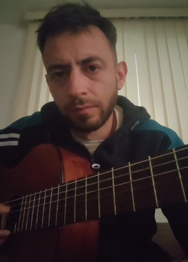 A man in a black and teal hooded jacket is playing a classical guitar. He looks directly at the camera with a slightly furrowed brow. The guitar is a reddish-brown color with dark strings. Behind him is a white window shade with vertical slats. The lighting is somewhat dim.