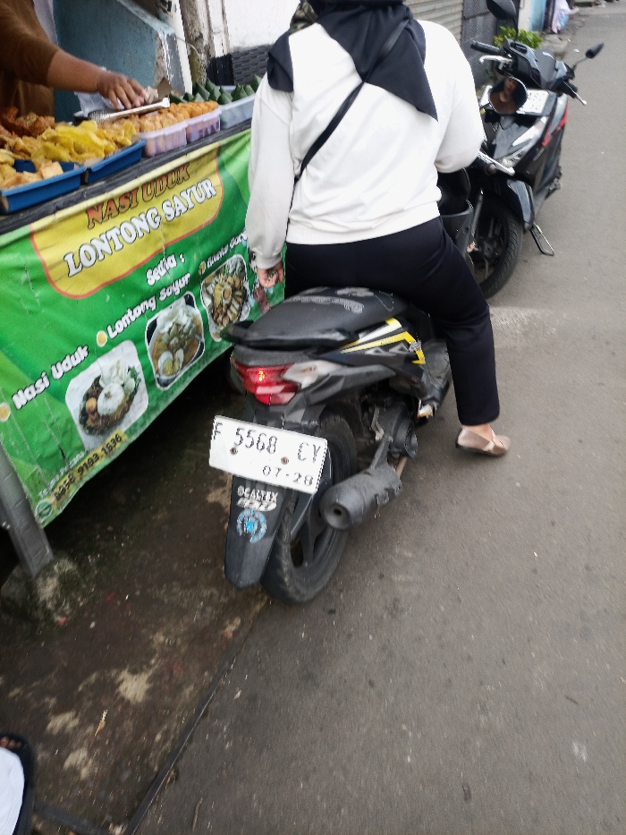 A person wearing a black hijab and white sweatshirt sits on a black scooter. The scooter's license plate reads "F 5568 CY 07-28." The scooter is parked next to a food stall, marked by a banner that reads "NASI UDUK LONTONG SAYUR," advertising "Nasi Uduk" and "Lontong Sayur." Fried food is visible in the stall's display. Another scooter is parked nearby. The street appears to be a residential area.