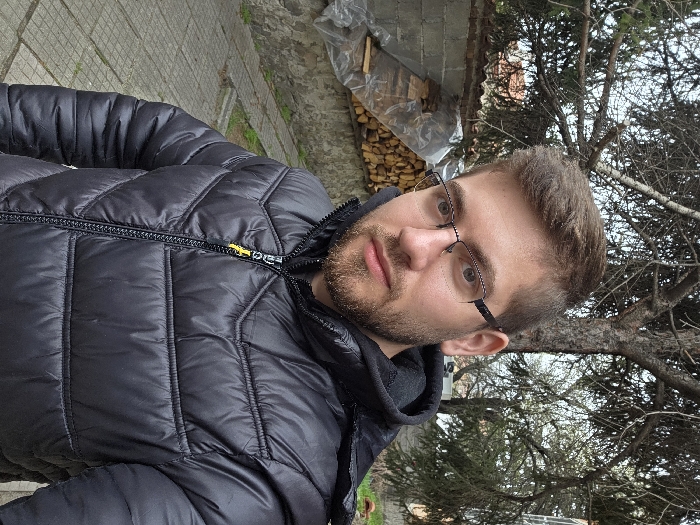 A male subject is depicted outdoors in Yagodovo, Bulgaria, gazing directly into the lens. The subject possesses short, light brown hair, a trimmed beard, and mustache, and wears dark-framed eyeglasses. He is clad in a black puffer jacket featuring prominent horizontal and V-shaped quilting, a central zipper with a yellow pull tab, and a visible hooded collar. The background includes a low concrete block wall supporting a stack of cut firewood, partially covered by clear plastic sheeting, situated to the subject's left. A large deciduous tree with bare branches dominates the upper background. Grey square paving stones comprise the ground surface in the lower left. The ambient light suggests an overcast sky.