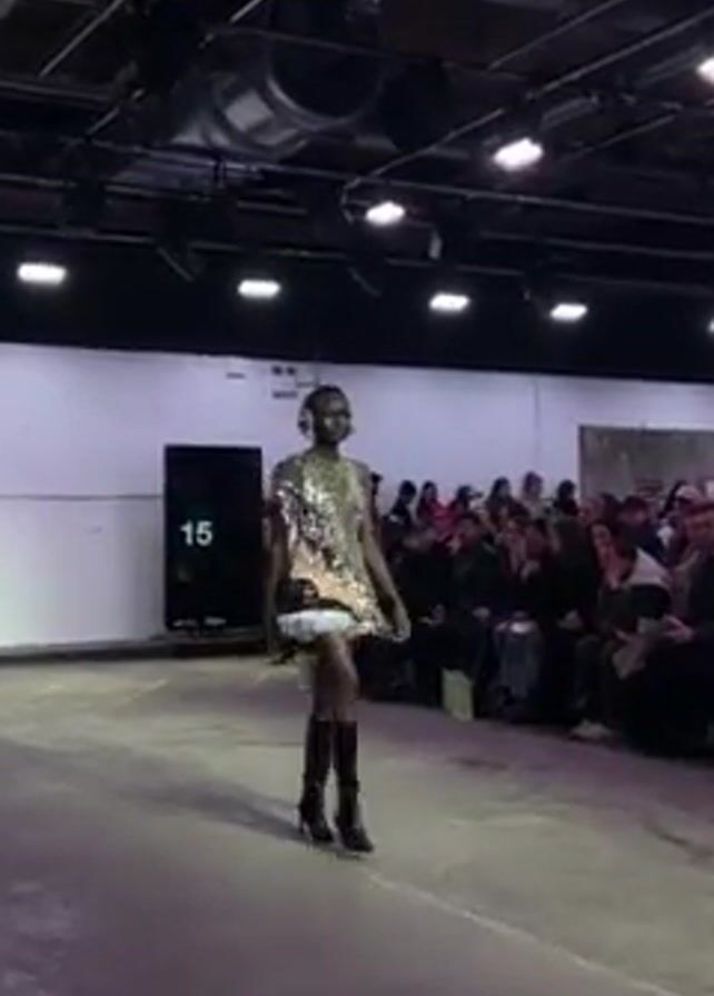 fashion model walking down a runway. The model is dark-skinned and wearing a short, glittery silver dress with a white ruffle at the bottom, and black knee-high boots. She also has decorative earpieces. The runway is a concrete floor, and the room is large with exposed pipes and ducts. There are people sitting on both sides of the runway, watching the show. The lighting in the room is bright, and there is music playing. Another model appears briefly as the main model approaches the camera.