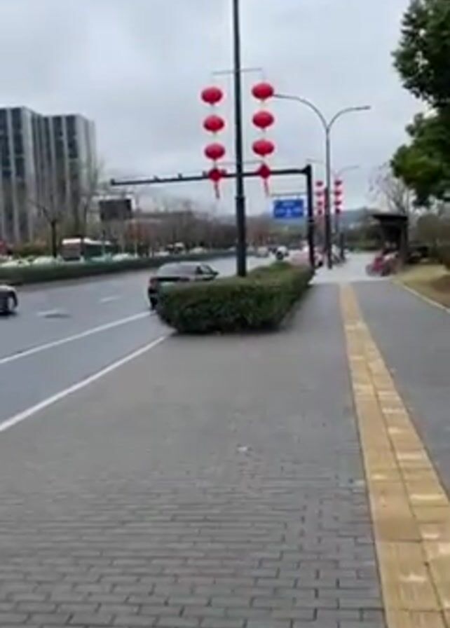 street scene on a cloudy day. Cars are driving on the wet asphalt road. A brick sidewalk with a yellow textured guide is alongside the road. A row of green bushes separates the road from the sidewalk. Several tall street lamps decorated with red Chinese lanterns line the street. A person on a red bicycle rides on the sidewalk. Tall buildings can be seen in the background. A bus stop is visible on the sidewalk.