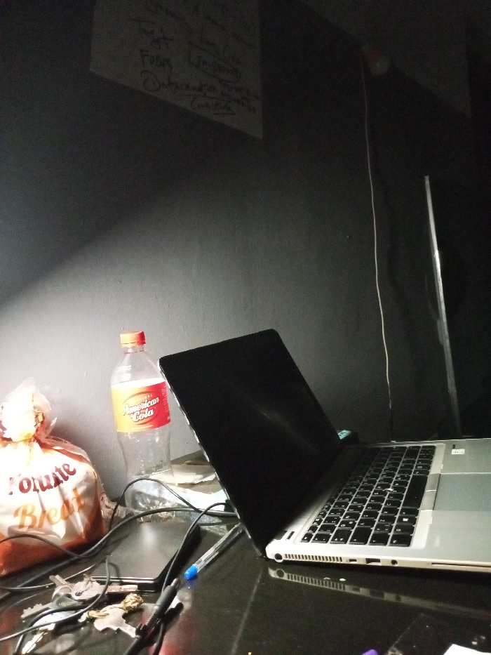 The image captures an indoor scene in Aramoko-Ekiti, Nigeria, illuminated by a localized light source, casting shadows against a dark gray wall. In the immediate foreground, a silver-colored laptop computer with a black keyboard is open on a dark, reflective surface, its screen appearing black. To the left of the laptop, a blue-capped pen, a cluster of black cables, a set of metal keys, and a small black electronic device are arranged on the surface. Further left, a clear plastic bottle of "American Cola" with an orange cap and minor residual liquid stands beside a transparent plastic bag containing a loaf of "Fortune Bread." On the dark gray wall in the upper left background, a light-colored paper with handwritten text, including "Trust," "Focus," and "Obinwanne," is affixed. A thin, light-colored electrical wire descends vertically along the dark wall on the right side of the frame, originating near a faintly visible orange fixture at the top right. A tall, vertical reflective element is partially visible on the far right edge of the frame. No human subjects are present.
