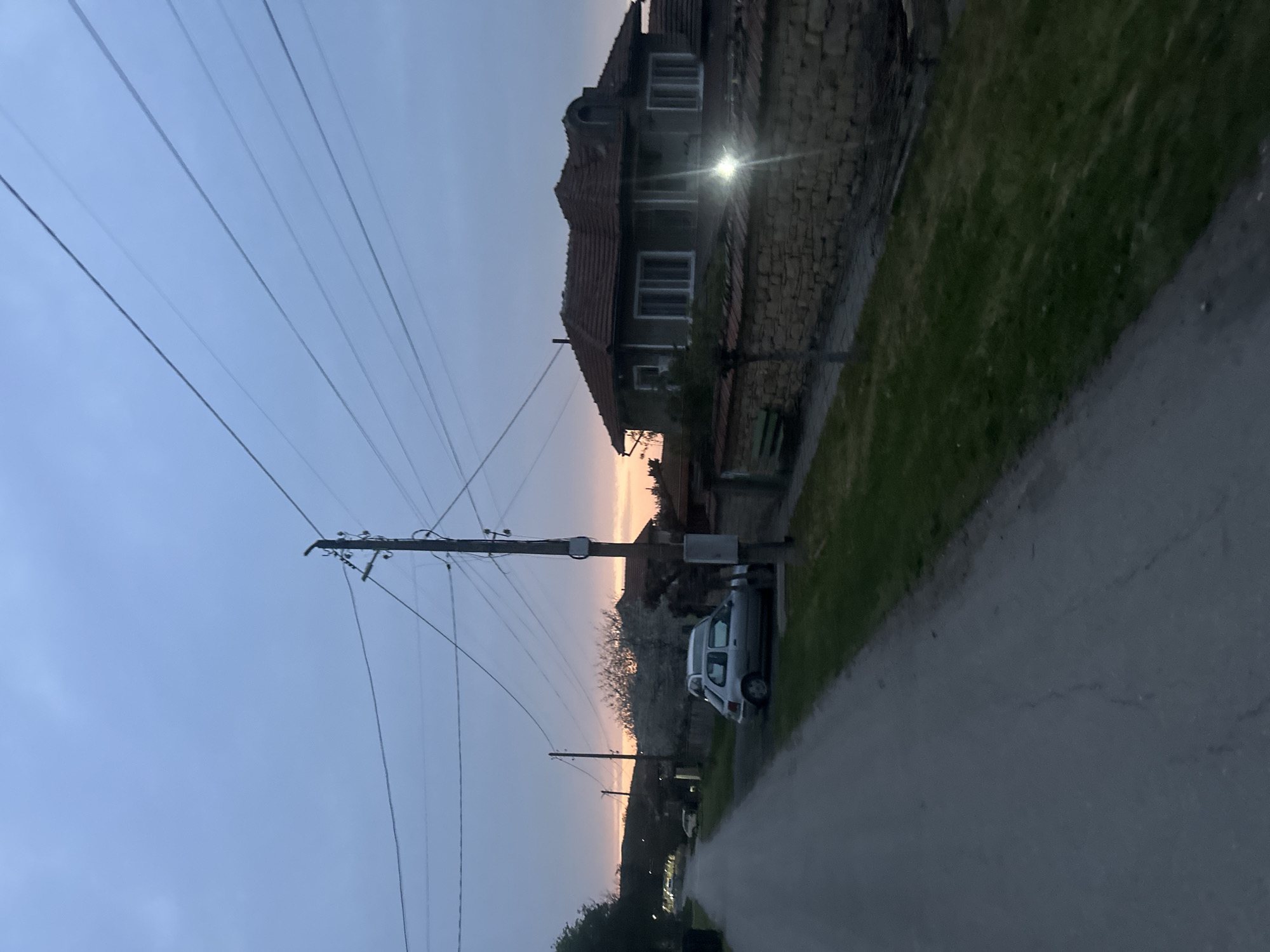The image presents a view in Kutsina, Bulgaria at twilight. A rural road stretches into the distance, lined on one side by a stone wall and a grassy verge, and on the other by a series of utility poles with power lines. A house, possibly residential, stands behind the wall, with a light fixture illuminating part of its facade. A small, light-colored van is parked alongside the road. The sky is a gradient of blue and orange, indicative of either dawn or dusk. The scene is still and quiet, suggesting a sparsely populated area.