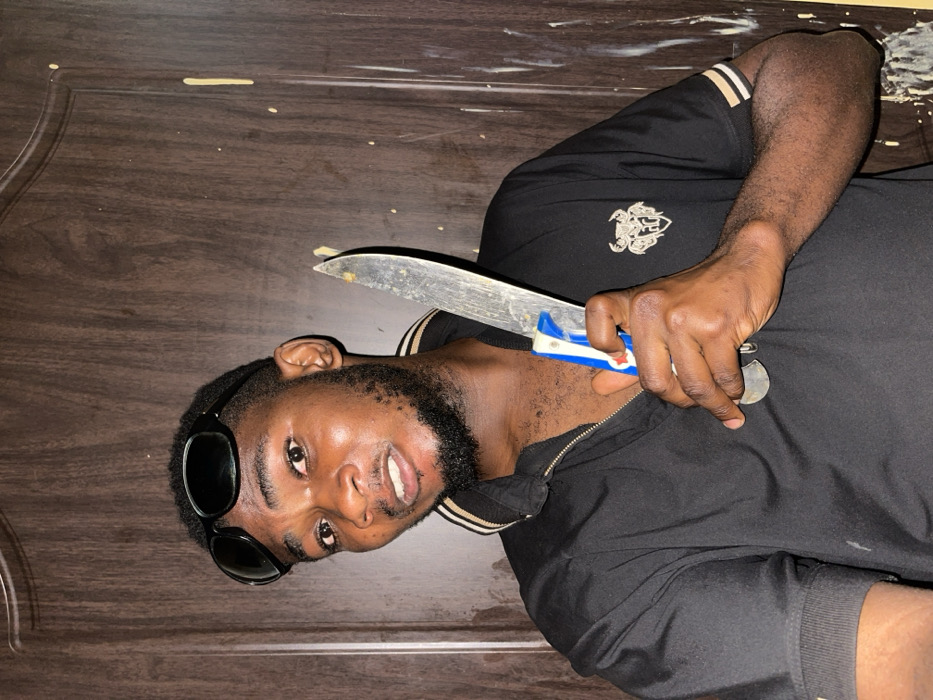 A bearded man with sunglasses is lying on a wooden floor. He holds a knife to his own throat. The knife has a blue and white handle and a large, dirty blade. The man wears a black shirt and faces the camera with a slight smile. Splatters are scattered on the floor.