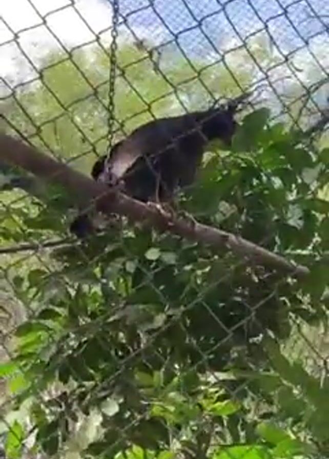 bird perched on a branch inside a caged enclosure. The bird is primarily black, with a noticeable crest on its head. The branch it's perched on is among green foliage. A metal chain hangs from the top of the enclosure. The cage is made of wire mesh, and sunlight filters through the mesh and the surrounding trees.