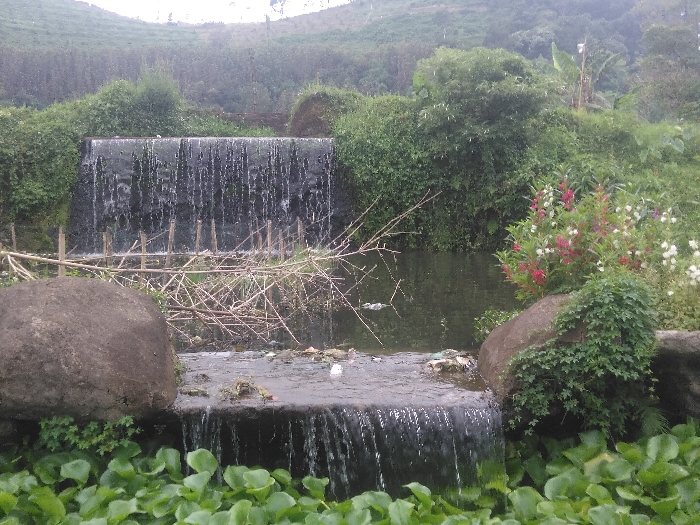 This image captures a multi-tiered waterway and dense foliage within the city of Kladno, Czechia. In the foreground, a dark, man-made weir allows water to cascade into a lower area covered by a dense mat of bright green, large-leafed aquatic plants. To the left, a prominent, rounded dark gray boulder rests. To the right, another similar boulder is partially obscured by green climbing plants, situated beside a bush displaying numerous small red and white flowers. Between the foreground and mid-ground weirs, a calm section of water is visible, containing floating debris including plastic items and scattered dry tree branches. In the mid-ground, a second, wider man-made weir forms a larger waterfall, with a continuous sheet of water flowing over its dark surface. Behind this upper weir, a basic barrier or fence constructed from vertical and horizontal wooden poles is partially visible in the water. The background features steep hills covered with thick green foliage and taller trees, extending towards an obscured sky. No individuals or animals are present.