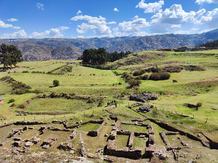 This image depicts an archaeological site on the outskirts of Cuzco, Peru, viewed from an elevated perspective under a clear blue sky with scattered white clouds