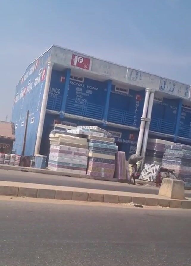 two-story building with "ROYAL FOAM" written on it. There are stacks of mattresses in front of the building. People are seen carrying mattresses. A yellow auto-rickshaw passes by on the road. The weather appears to be sunny.