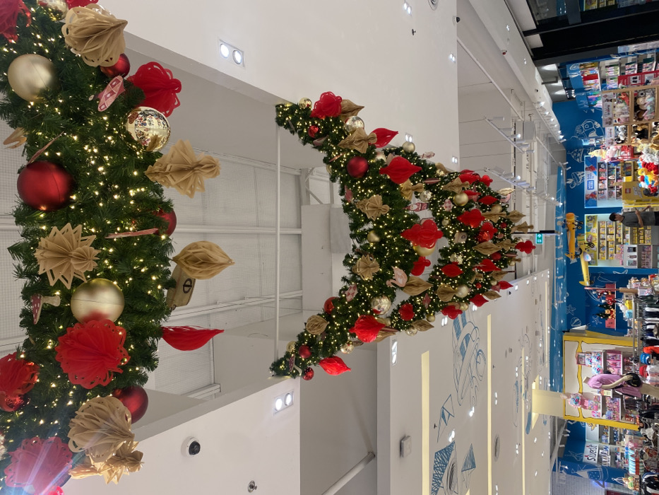 The image displays the brightly lit interior of a retail establishment located in Baan Chaweng, Thailand, heavily decorated for the holiday season
