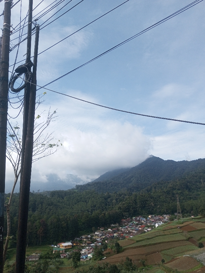 This image captures a panoramic outdoor scene from an elevated vantage point in Thanthirimale, Sri Lanka. In the immediate foreground on the left, two dark brown utility poles stand vertically, adorned with multiple black electrical or communication wires running horizontally and diagonally, with some wires coiled around one pole. A thin, sparsely-branched tree or sapling with a few light green leaves extends upwards between the poles. The midground reveals a valley landscape. A cluster of numerous small houses, characterized by varying colored roofs, forms a village settlement nestled within the valley. To the right of the village, the terrain slopes upwards, featuring extensively terraced agricultural fields with visible rows of cultivation in shades of brown and green. Dense, dark green forest covers the surrounding hillsides and lower mountain slopes. A tall, slender lattice transmission tower is faintly visible on a distant forested slope to the right. The background consists of majestic, heavily forested mountains rising into the sky. The upper portions and peaks of these mountains are partially enveloped by expansive white and gray cloud formations, suggesting a misty or cloudy atmosphere. The sky above is a clear, light blue with scattered thin white clouds. No people or overt actions are discernible within the frame.