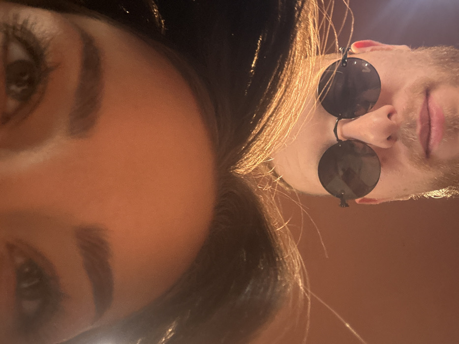 The image displays a close-up, dual-person portrait, likely a selfie, taken indoors within the city of Sofia, Bulgaria. The upper portion of the frame features the forehead, dark, prominent eyebrows, and the visible brown irises of two eyes belonging to an individual, consistent with female features. Dark brown hair frames this individual's face, with strands extending downwards. Below this, occupying the lower half of the frame, is a male subject with a light brown beard and stubble. He wears dark, round-rimmed sunglasses. His expression is neutral with a closed mouth. The hair from the upper individual appears to drape across the top of the lower individual's head, creating a direct visual interaction. The background is a uniform, warm orange-brown, suggesting a consistent artificial light source and lacking any discernible environmental features.