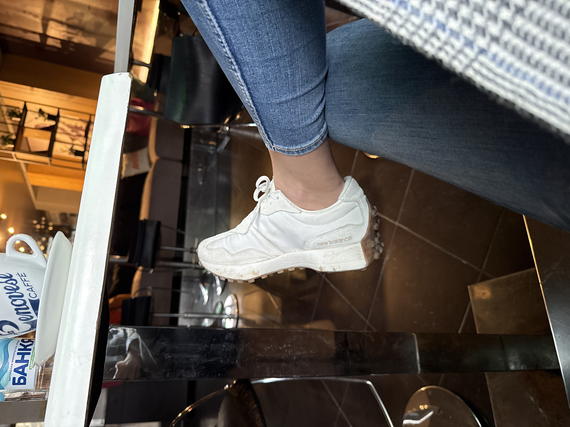 This image depicts the interior of a modern café in Shumen, Bulgaria, specifically identified as Dolce Caffe. The perspective is from a seated position, looking downwards and forwards. In the upper left foreground, a portion of a white table is visible. On this table, a small plastic bottle of "БАНКА НАТУРАЛНА МИНЕРАЛНА ВОДА" (BANKA NATURAL MINERAL WATER) and a white ceramic coffee cup bearing the "genovese CAFFE" logo in blue, resting on a white saucer, are present. The right side of the frame features the lower body of an individual, seated with one leg crossed over the other. The person is wearing blue denim jeans. On the visible foot is a white New Balance 327 sneaker, identified by the "new balance" text on the sole and the shoe's design; the sole shows minor dirt accumulation. A segment of a grey and white patterned garment is partially visible on the far right. The midground and background reveal the cafe's interior. The floor consists of dark, reflective tiles. A dark, possibly metallic, table support extends from the foreground table to the floor. In the background, several bar stools with dark seats and chrome bases are visible. Further back, a grey upholstered sofa or seating area is discernible. A wooden shelving unit, holding plants and white decorative items, stands against a wall. The scene is illuminated by warm, ambient lighting, creating reflections on the polished floor and metallic surfaces.
