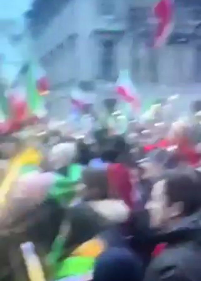 crowd of people waving Iranian flags and cheering in what appears to be an urban setting. The flags are prominently displayed, and the crowd seems to be participating in a protest or demonstration. The buildings in the background suggest a city environment. People are holding up their phones to record. The weather appears overcast.