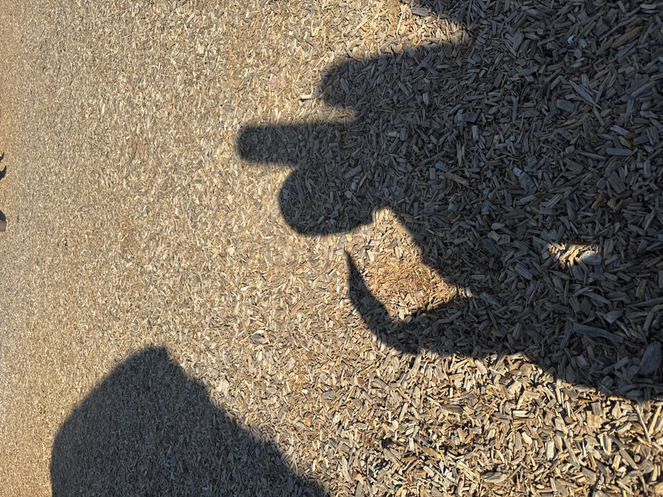 The image displays ground covered in small wood chips, with shadows cast across the surface