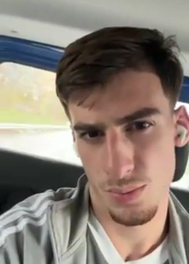 A man wearing a gray and white zip-up jacket and white earbuds films himself sitting in a car