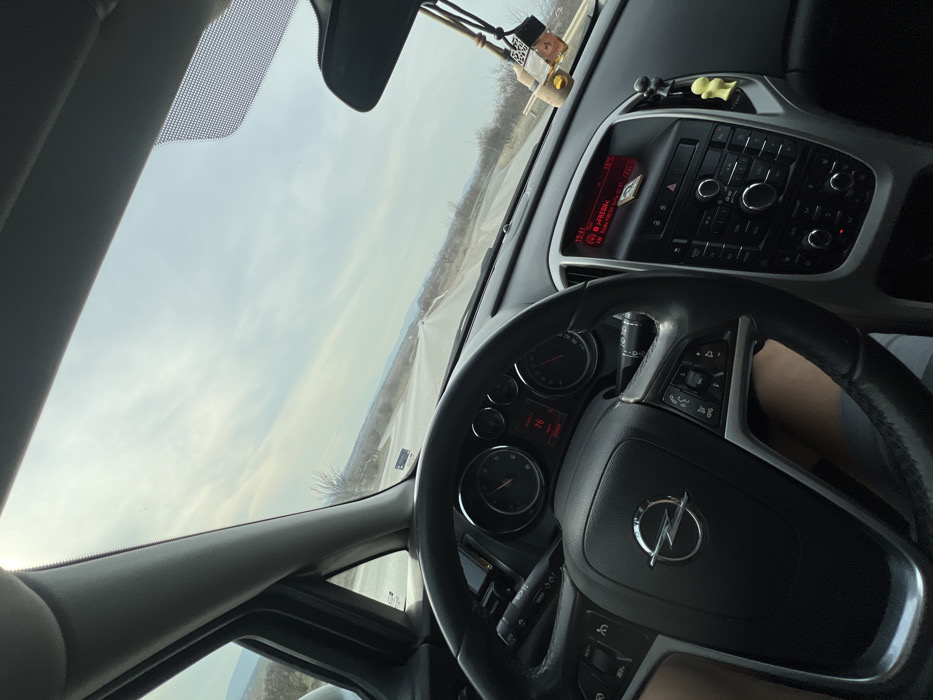 The image captures the interior of an Opel Astra J vehicle from the front passenger side, looking forward through the windshield