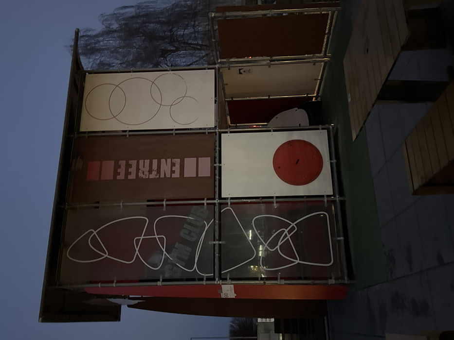 A tall, rectangular structure displays a series of artistic panels. The top panel features intersecting circles. Below, a brown panel reads "ENTREE" in reverse. Another panel displays a white abstract design on a red background, and next to it, a white panel has a large red circle. The bottom panels have white abstract designs on dark backgrounds. The structure is framed by metal tubing and stands outdoors, near seating.