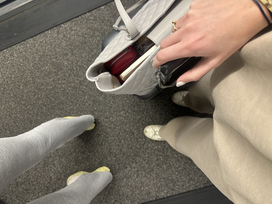 From a high angle, the image captures a person reaching into a grey quilted handbag. Inside, there's a red pouch and other items. The person wears light beige pants and cream-colored sneakers. To the left, another person's feet, clad in grey leggings and yellow athletic socks, are visible on what looks like grey carpet. The backdrop features a dark grey surface.